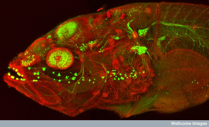 Confocal micrograph of a cavefish embryo at around five-days-post-fertilization, viewed from the side (lateral view). The embryo has been stained with an antibody that targets a calcium binding protein (calretinin) shown in green, which highlights different neuronal types and their processes in the nervous system. This staining also reveals taste buds, that in the cavefish are located around the mouth and extend along the body.