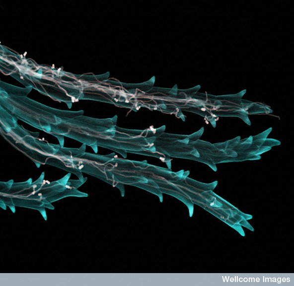 Fluorescent micrograph showing wheat stigmas infected with the ergot fugus (Claviceps), which causes ergotism in humans.