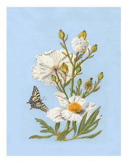 'A Proud Poppy of California' Matilija Poppy (Romneya coulteri) and Western Tiger Swallowtail. The artist writes: These huge and beautifully scented flowers belong to a family of plants first discovered in the Santa Ana mountains by Irish botanist Thomas Coulter during his travels around southern California between 1826 and 1836. The Latin name is tribute to him and his great friend, the Irish astronomer Romney Robinson.